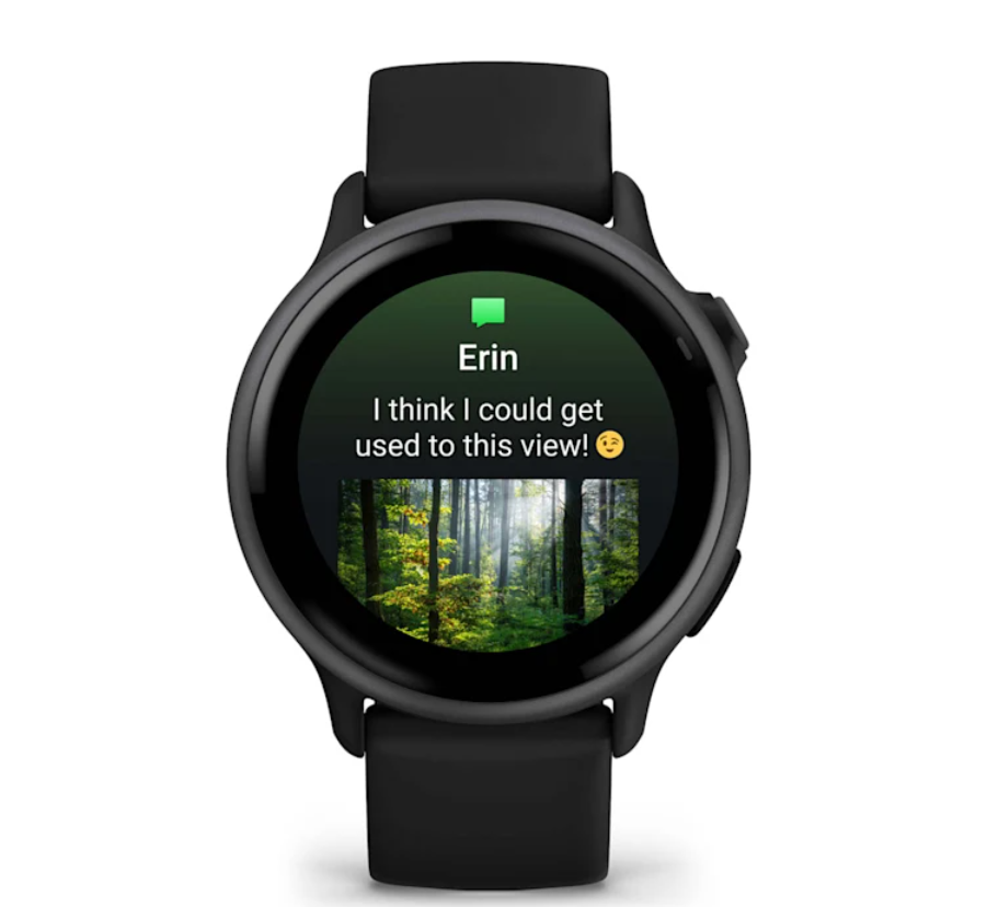 Recibe correos electrónicos, mensajes de texto y alertas en el reloj cuando esté vinculado a un smartphone Android o iPhone. Con un teléfono Android, podrás responder a los mensajes de texto con el teclado del reloj y ver las fotos recibidas directamente en la pantalla del reloj.